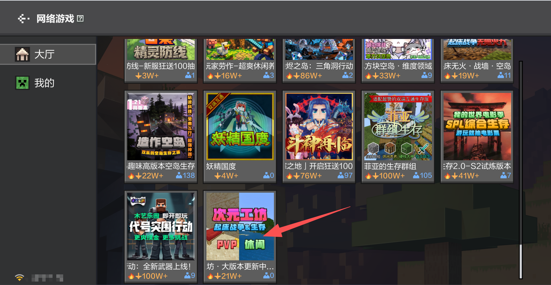 在网络游戏列表中,下滑浏览或使用搜索功能筛选,找到「次元工坊」服务器。